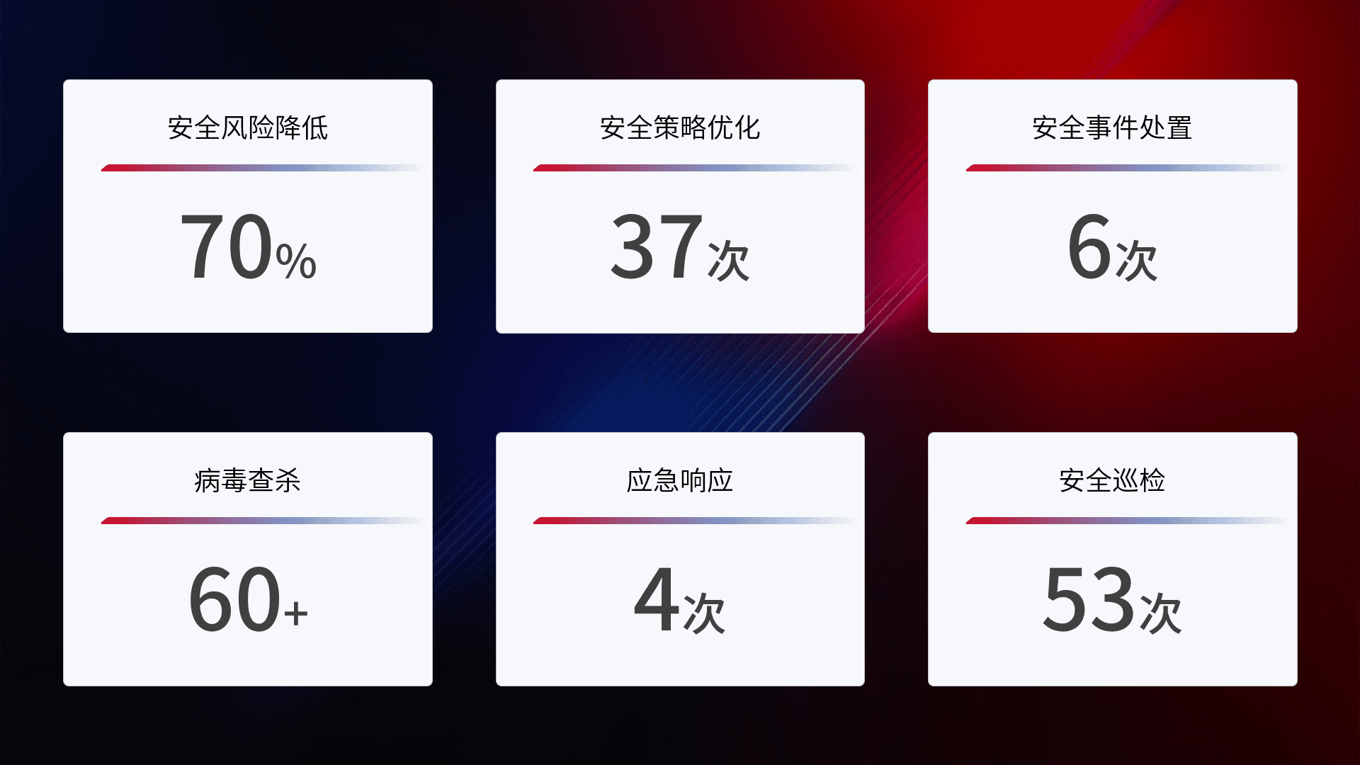 提供全面的安全事件报告体系,,包括处置报告、、周报、、、、季度和年度总结,,,结合持续监控,,,帮助客户深入了解网络安全状况。。。