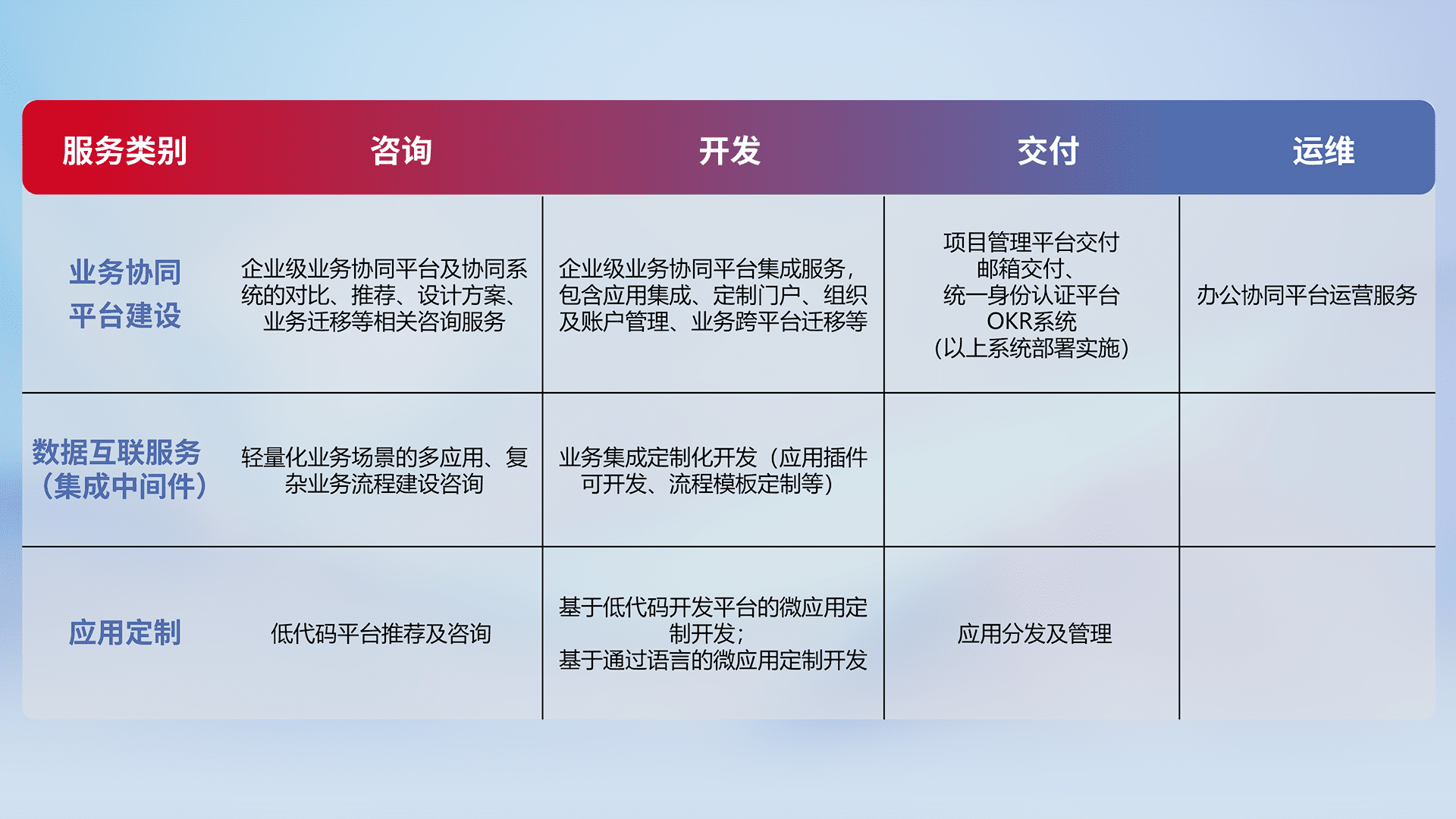 针对钉钉、、、企微、、IDaas等平台级产品提供产品的规划、、、、方案、、交付、、、、定制化开发等服务,,,,实现如统一协同办公、、、、智能客户服务、、、混合会议管理、、智能数据查询、、、、等业务场景,,,实现数字化转型。。。。